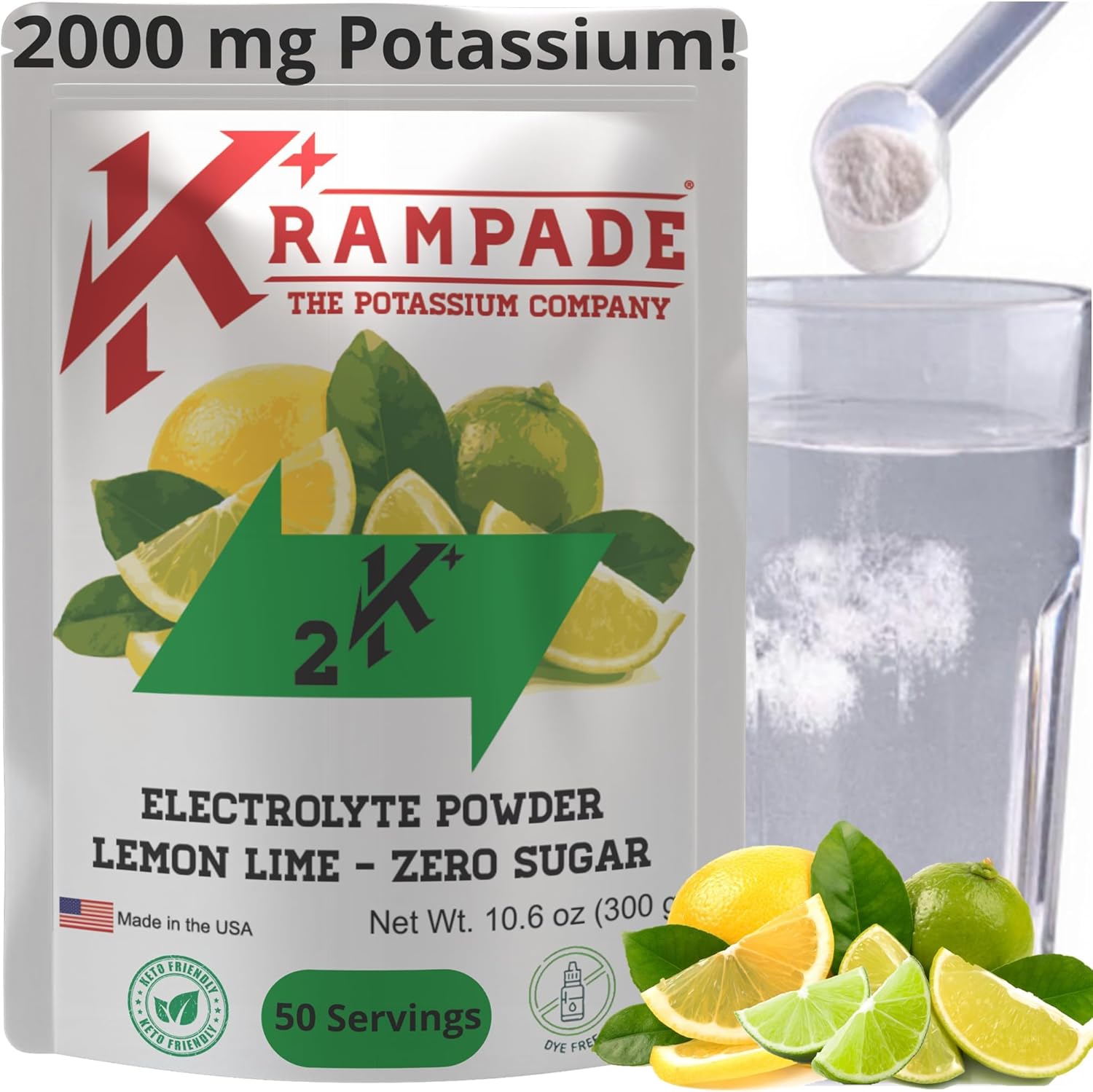 Krampade High Potassium Electrolytes Powder Zero Sugar Lemon Lime, 4180mg Electrolytes, 2000mg Potassium, Cramp Relief & Prevention, Cellular Hydration, Better Endurance & Recovery, Keto, 50 Servings