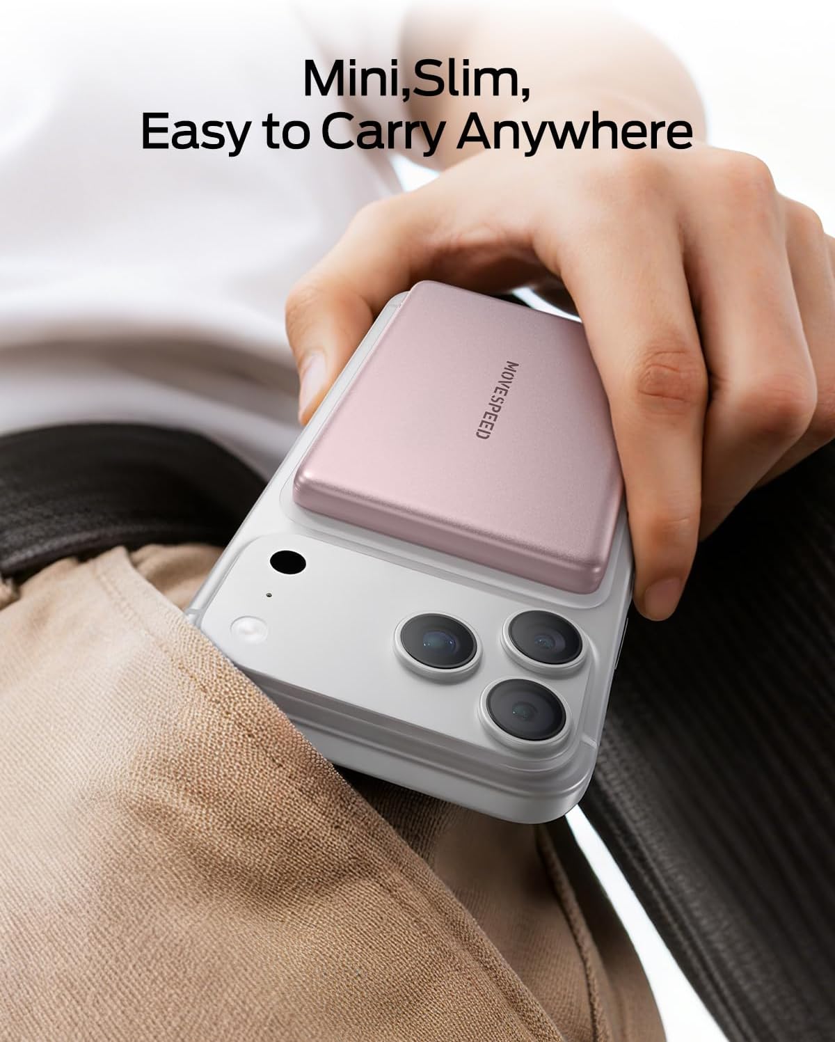 MOVE SPEED 0.3” Ultra Slim MagSafe Portable Charger, 5000mAh Magsafe Battery Pack iPhone 17 Air Accessories, Magnetic Power Bank with USB C Port for iPhone 17 Pro Max Air/16/15/14/13/12, Pastel Pink
